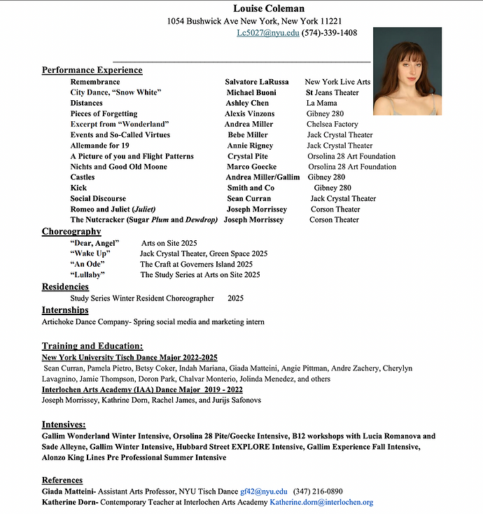 Louise Coleman is a New York-based dancer-choreographer. Louise’s work questions the relationship between mundane gestures and human desires, internal improvisational research and performance, and task-driven play and character building. Her work has been performed at the Jack Crystal Theater, Green Space, The Craft, and Arts on Site. She was in residence with the “Study Series” this past fall and founded the contemporary/experimental collective, LoCo dance Co. Louise received her high school education from Interlochen Arts Academy and received her BFA in Dance from New York University Tisch School of the Arts spring 2025. As a dancer she has performed works by and in collaboration with Ashley Chen (La Mama), Annie Rigney, Bebe Miller, Sean Curran, City Dance, Smith and Co, and others. She recently had her New York Live Arts debut performing "Remembrance" with Salvatore LaRussa Dance Theater.